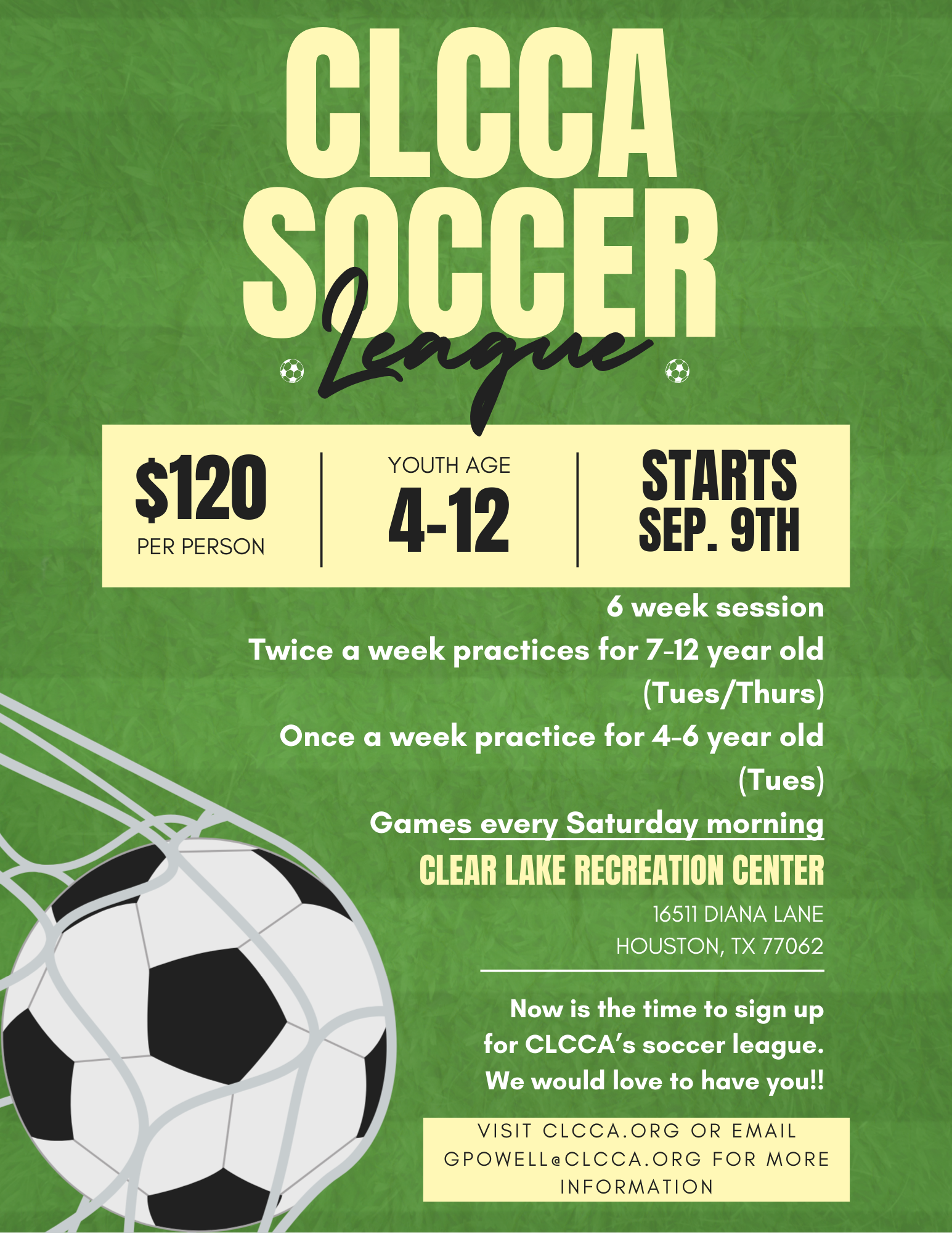 Looking for a soccer league that is local? Join a team at CLCCA. Our fall soccer league will start September 9th, 2025.